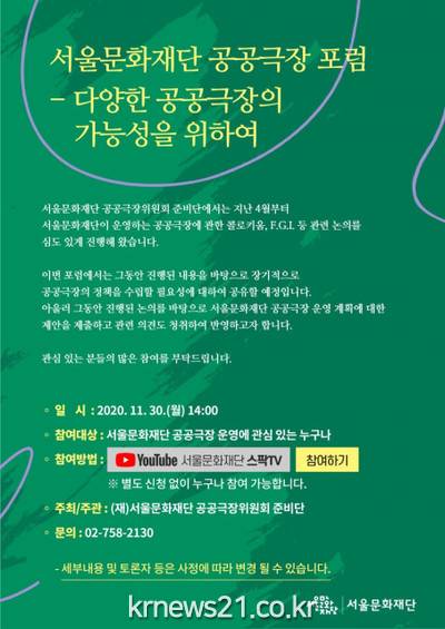 ▲ [사진=홍보포스터]서울문화재단(대표이사 김종휘)은 장기적으로 공공극장의 정책을 수립할 필요성에 대해 공유하는 포럼 ‘다양한 공공극장의 가능성을 위하여’를 30일(월) 오후 2시 서울문화재단 유튜브 ‘스팍TV’에서 개최한다.