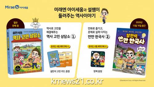 ▲ [이미지제공 = 미래엔]교육출판전문기업 미래엔의 아동출판브랜드 아이세움이 우리 역사의 주요 스토리를 흥미로운 만화로 풀어낸 ‘설민석의 만만 한국사 2’와 역사 이야기로 어린이들의 고민을 해결해주는 ‘설민석의 역사 고민 상담소 1’을 출간한다고 밝혔다.