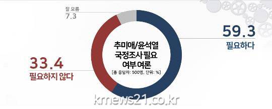 여론조사 전문기관 리얼미터가 지난달 30일 전국 만 18세 이상 500명을 대상으로 `추미애 장관과 윤석열 총장에 대한 국정조사의 필요 여부`를 물은 결과, `필요하다`가 59.3%로 집계됐다. 응답자 33.4%는 `필요없다`고 답했다. `잘 모르겠다`는 응답은 7.3%였다.
