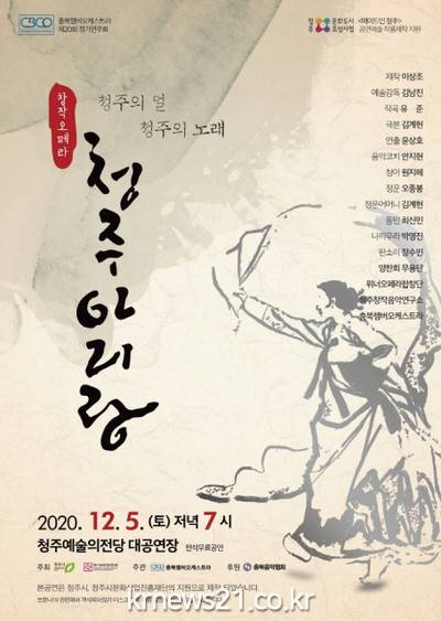▲ [사진=홍보포스터]청주시와 청주시문화산업진흥재단이 주최하고 충북챔버오케스트라가 주관하는 청주문화도시 조성사업 ‘메이드인 청주’ 선정 작품인 창작오페라 ‘청주아리랑’이 청주 시민들에게 그 화려한 막을 올린다.