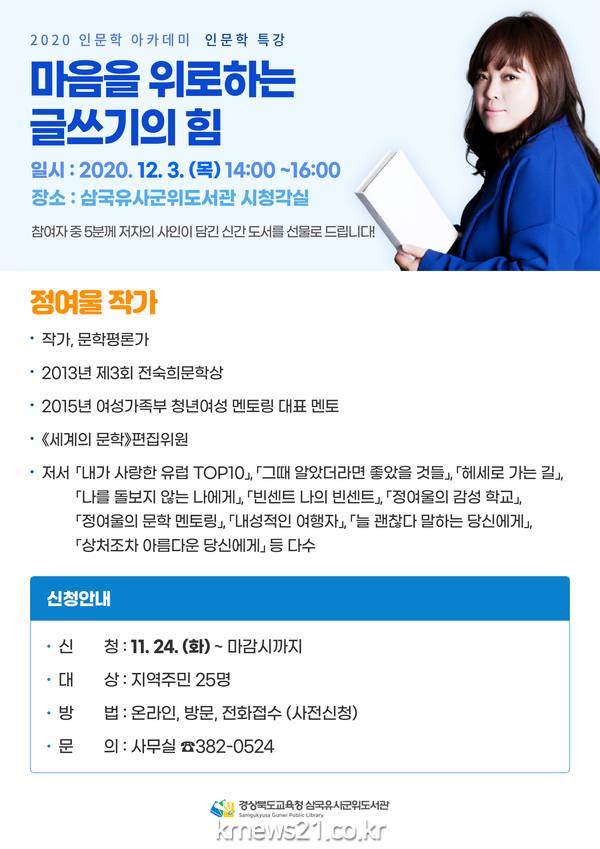 경상북도교육청 삼국유사군위도서관(관장 김영재)은 오는 12월 3일 오후 2시 정여울 작가를 초청해 인문학 특강을 개최한다고 밝혔다.