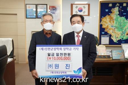 진천읍 소재 ㈜원진이 2일 재단법인 진천군장학회(이사장 송기섭 진천군수)에 장학금 1,000만원을 기탁했다.