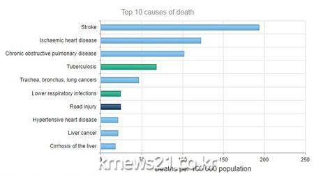 10일 WHO의 '2019 세계 건강 추정' 보고서에 따르면 지난해 북한의 최다 사망원인은 뇌졸중으로, 인구 10만 명당 193.4명이 이 병으로 사망했다. 그 뒤를 심혈관질환(122.1명. 이하 인구 10만 명당 사망자수)과 만성폐쇄성폐질환(102명)이 이었다.