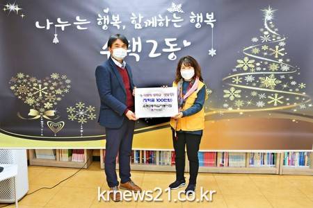 ▲ [사진제공 = 구리시]구리시(시장 안승남) 수택2동에서는 지난 9일 ‘적십자 수택2동봉사회(회장 최인정)’로부터 복지 사각지대 저소득 청소년에게 장학금으로 사용해 달라고 기부금 1백만원을 전달받았다.