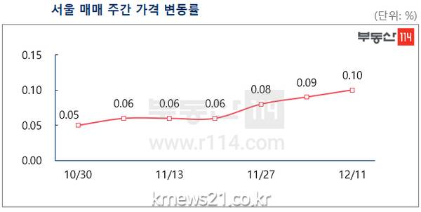 부동산114의 주간 아파트 동향에 따르면 이번주 서울 아파트 매매가격은 0.10% 올라 3주 연속 상승폭이 확대됐다. 재건축 아파트는 0.11%, 일반 아파트는 0.10% 올랐다. 경기ㆍ인천과 신도시도 각각 0.10%, 0.17% 올라 상승폭이 커졌다. 수도권 전세시장은 서울이 0.19% 상승했고 경기ㆍ인천과 신도시는 각각 0.11%, 0.17% 올랐다.