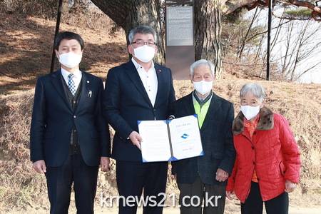 예천군(군수 김학동) 감천면 수한리 한티마을 북쪽 한티고개에 위치하고 있는 ‘예천 수한리 소나무’가 지난 10월 경상북도 지정문화재(기념물) 제180호로 지정된 가운데 문화재 지정서를 소유자인 안상진씨에게 전달했다.