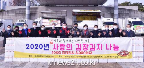 이날 행사는 이용섭 시장, 장재성 광주시의원, 한수영 두레청과 대표, 한상우 한두레농산·한듬레포츠 대표, 최석준 모아주택산업 부회장 등이 참석한 가운데 관내 업체인 두레청과㈜, 한두레농산㈜, ㈜한듬레포츠, ㈜모아주택산업에서 이웃사랑의 마음을 모아 마련한 10㎏ 김장김치 3000상자를 시·구자원봉사센터, 지역아동센터, 장애인시설 등 사회복지 기관에 전달하는 순서로 진행됐다.