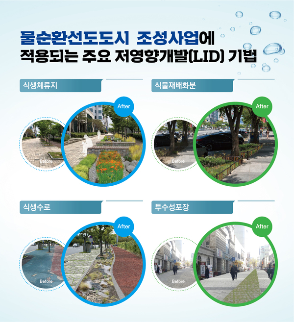 기존 공공도로의 가로수 주위에 식생체류지, 식물재배화분, 나무여과상자 등을 현장여건 및 주변경관과 어울리게 설치하고 인도, 자전거도로, 주차장에 전면투수블록, 집수형블록, 저류형블록, 잔디블록 등 다양한 투수성포장도 설치하게 된다.