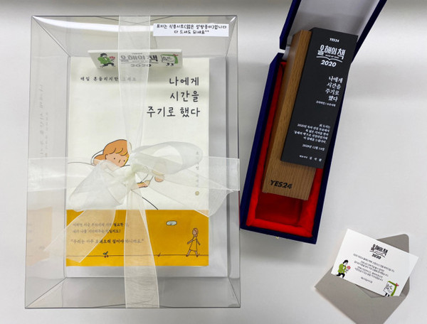 11월 9일부터 30일까지 진행된 예스24의 ‘2020 올해의 책’ 투표에는 출판사 수오서재에서 낸 오리여인의 <나에게 시간을 주기로 했다>가 1위 도서로 선정된 바 있다. 예스24는 당초 예정된 부상 대신 함께 기부를 제안한 1위 도서 출판사 수오서재에 감사패와 도서 표지를 모티브로 한 케이크를 제작해 선물했다.