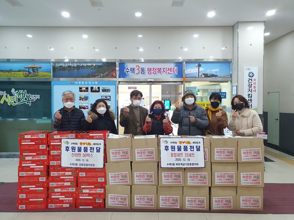 ▲ [사진제공 = 구리시]구리시(시장 안승남)는 지난 18일 수택3동 행정복지센터에서 바르게살기위원회(위원장 서영옥)와 경로당협의회(회장 문춘기) 후원으로 연말연시를 맞이하여 취약계층에 대한 관심과 나눔을 실천하고자 ‘이웃돕기 물품 전달식’을 개최했다.