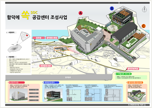 도시재생인정사업(함덕리)은 2019년 12월 도시재생특별법 개정에 따라 도입된 신재생사업으로 함덕리 지역에 부족한 생활 SOC를 확충하기 위해 제주시와 지방공기업인 제주개발공사가 함께 협업하여 올해 2월부터 사업발굴을 시작으로 8월에 사업 추진에 따른 기본업무협약을 체결하여 두 기관 모두 적극적인 참여와 역량을 집중함으로써 중앙공모에 선정되는 성과를 이뤄냈다.