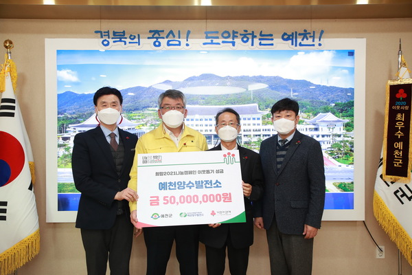▲ [사진제공 = 예천군]예천군(군수 김학동)은 22일 오전 10시 한국수력원자력(주) 예천양수발전소(소장 박승철)(이하 ‘예천양수발전소’)에서 군수실을 방문하고 ‘희망2021 나눔캠페인’ 이웃돕기 성금 5천만 원을 기탁했다고 밝혔다.