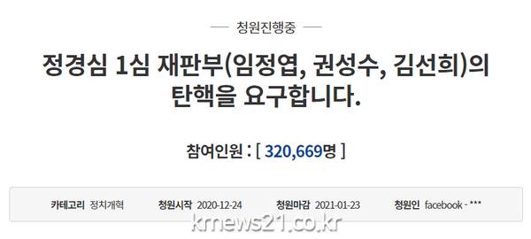 청와대 국민청원 게시판엔 지난 23일 올라온‘정경심 1심 재판부의 탄핵을 요구합니다’라는 제목의 게시물은 올라온 지 사흘 만엔 26일 오전 9시 30분 현재 32만여명의 동의를 얻었다.