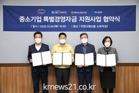 ▲ [사진제공 = 이천시]이천시(시장 엄태준)는 코로나19로 경영애로를 겪고 있는 관내 중소기업을 위해 지난 24일 중소기업 특별경영자금 지원사업 협약식을 개최했다. 이천시 특별경영자금 지원사업은 2019년 일본의 화이트리스트 제외 조치 이후 마련되어 2020년 농협은행과 진행되었다. 코로나19로 중소기업의 악화되는 경영난 극복지원을 위해 이천시는 2021년부터 특별경영자금을 대폭 확대했다.
