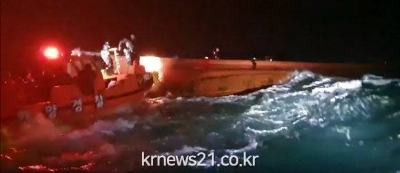 제주해양경찰서에 따르면 전날(29일) 오후 7시44분께 제주항 북서쪽 약 2.6㎞ 해상에서 제주시 한림 선적 저인망어선 32명민호(39톤)가 전복됐다는 신고가 들어왔다.