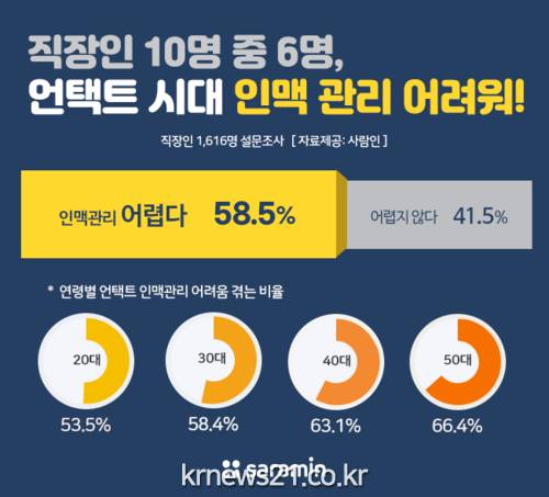 구인구직 매칭 플랫폼 사람인(대표 김용환)이 직장인 1,616명을 대상으로 ‘언택트로 인한 인맥 관리 어려움’을 조사한 결과, 58.5%가 ‘어려움을 겪는다’고 밝혔다.