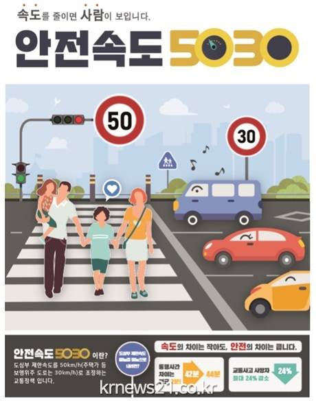 ‘안전속도 5030’은 도로 위 보행자의 안전과 교통사고 발생 시 사망자를 줄이기 위해 일반도로는 50㎞/h(필요시 60㎞/h), 주택가 등 이면도로는 30㎞/h 이하로 도시부도로의 제한속도를 용도와 상황에 따라 조정하는 범정부 안전정책이다.