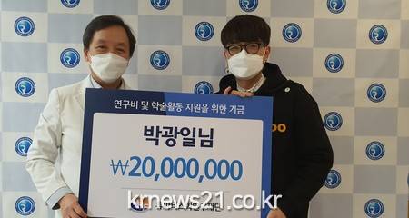 박광일 강사는 5일 대한류마티스학회 회장인 김태환 한양대학교 교수에게 연구비 및 학술활동을 위한 기금 2천만 원, KOAS(강직성척추염환우회)에 강직성 척추염을 앓고 있는 중·고등학생들 치료비와 학비에 써달라며 1천만 원을 전달했다.