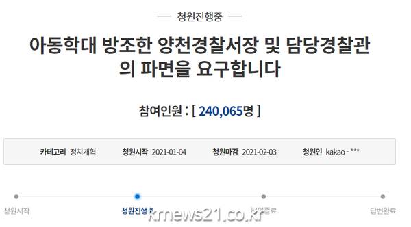 지난 4일 청와대 국민청원 홈페이지에 올라온 ‘아동학대 방조한 양천경찰서장 및 담당경찰관의 파면을 요구합니다’라는 제목으로 올라온 이 청원은 게시 하루 만인 5일 오후 20만 명 이상이 동의하며 청와대 답변 기준을 충족했다. 6일 오전 9시50분 기준으로는 24만 명을 넘어서며 빠르게 동의수가 올라가고 있다.