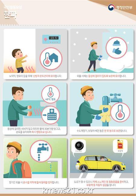 특히, 이번 한파 극복을 위해 부산시는 취약계층과 농작물 등 냉해 피해 방지에 적극적으로 나설 예정이다. ▲독거노인과 장애인 계층에는 도시락 배달, 안부 전화, 야간순회방문서비스 등 빈틈없는 돌봄 서비스를 지원해 취약계층 피해를 최소화할 계획이다. 또한, 쪽방 상담소와 같은 자활 시설을 통해 거리 노숙인에게 응급 잠자리도 제공한다. ▲수도관 동파 등 긴급신고는 ☎120으로, 정전 시에는 ☎123으로 전화하면 된다. ▲농어촌지역은 현장지도반을 통해 사전 순찰 및 점검을 긴급 실시한다.
