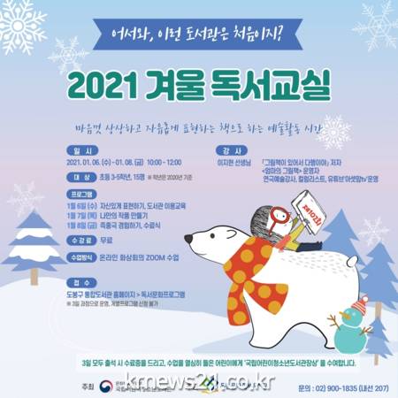 ▲ [사진=홍보포스터]도봉구(구청장 이동진) 도봉문화정보도서관은 코로나19로 집에서 겨울방학을 보낼 초등학생들을 위해 1월 6일(수)부터 1월 8일(금)까지 ‘2021 겨울 독서교실’을 운영한다.