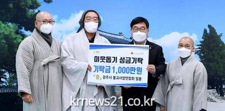 ▲ [사진제공 = 광주시]광주시 불교 사암연합회 회장 청호스님은 지난 5일 광주시청을 방문, 도움의 손길이 필요한 어려운 이웃에게 써 달라며 성금 1천만원을 기탁했다.