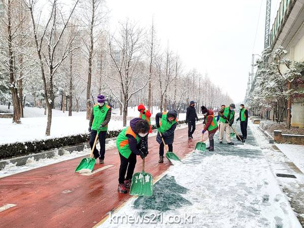 전날 내린 폭설로 인한 도로 결빙으로 시민들의 불편이 없도록, 단원들은 이른 아침부터 제설장비를 챙겨, 반별 맡은 구역에서 구슬땀을 흘리며, 보행로에 쌓인 눈을 치웠다.