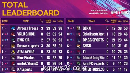 1월 9일(토)과 10일(일) 진행된 1주 차 경기 결과 위클리 파이널 초반부터 선두권을 지킨 한국의 Afreeca Freecs(아프리카 프릭스)가 우승과 1000만원 상금의 주인공이 됐다. 마지막 날 매치 3, 4, 5에서 6포인트를 더하는 데 그쳤지만 선두의 위엄을 과시하며 총 59킬 98포인트로 1위에 자리했다.