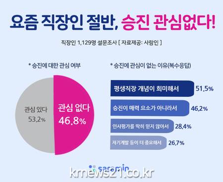 구인구직 매칭 플랫폼 사람인(대표 김용환)이 직장인 1,129명에 ‘인사평가와 승진에 대한 생각’을 조사한 결과 전체 응답자의 절반 가까이(46.8%)가 ‘승진에 관심 없다’고 답했다. 관심이 없는 가장 큰 이유로는 ‘평생직장 개념이 희미해서’(51.5%, 복수응답)가 꼽혔다.