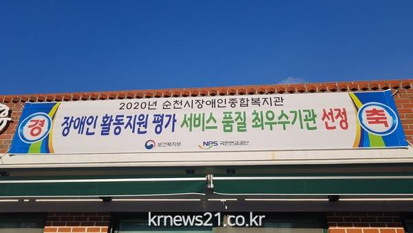 순천시 장애인종합복지관이 국민연금공단에서 실시한 2020년 장애인활동지원 평가에서 서비스품질평가 최우수 기관으로 선정됐다.
