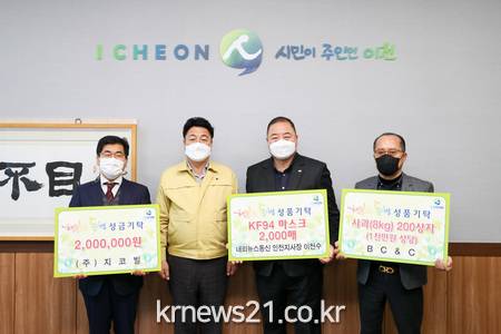 이어서, 내외뉴스통신 인천지사 이천수 지사장이 코로나19 감염병 예방을 위한 KF94마스크 2,000매를 기탁하였다. 이천수 지사장은 이천시 외에도 평창, 철원 등 전국 각 지역의 어려운 곳을 위해 아낌없는 나눔을 실천하고 있다.