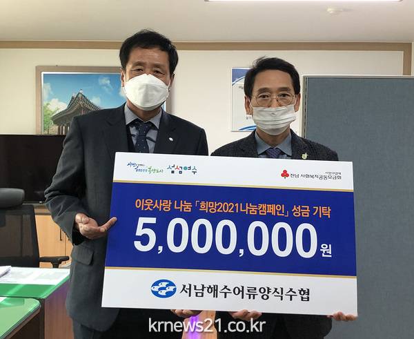 여수시는 지난 13일 서남해수어류양식수산업협동조합(조합장 이강호)에서「희망2021나눔캠페인」에 동참하고 이웃사랑 나눔을 실천하고자 성금 500만 원을 마련해 여수시에 전달했다고 밝혔다.