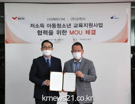 ▲ [사진제공 = 해피기버]사단법인 해피기버(이하 해피기버)는 13일 주식회사 교학사(이하 교학사, 대표 양진오)와 저소득 가정 교육지원사업 진행을 위해 업무협약을 체결했다고 밝혔다.