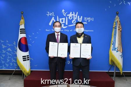 ▲ [사진제공 = 구리시]구리시(시장 안승남)는 14일 15시 시청 민원상담실에서 용인한국외국어대학교부설고등학교(교장 정영우)와 관내 초등학생을 대상으로 실시하는 ‘청소년 영어캠프(외대부고 사회공헌 HAFS CAMP) 업무 협약식’을 진행했다.