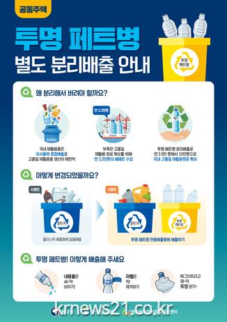 김포시는 지난해 10월부터 관내 공동주택 관리사무소를 통해 투명페트병 별도배출 홍보를 이어왔고, 새해에도 현장점검과 함께 전단지, 보도자료 등 주민 홍보를 강화할 계획이다.