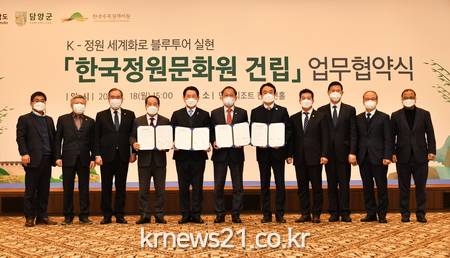 담양리조트에서 열린 이날 협약식에는 최형식 담양군수와 박종호 산림청장, 김영록 전라남도지사, 한국수목원관리원 김용하 이사장, 이개호 농림축산식품해양수산위원장 등이 참석해 국립 한국정원문화원의 성공적인 건립을 위한 실질적 업무협력과 지원체계 구축에 함께 노력하기로 했다.