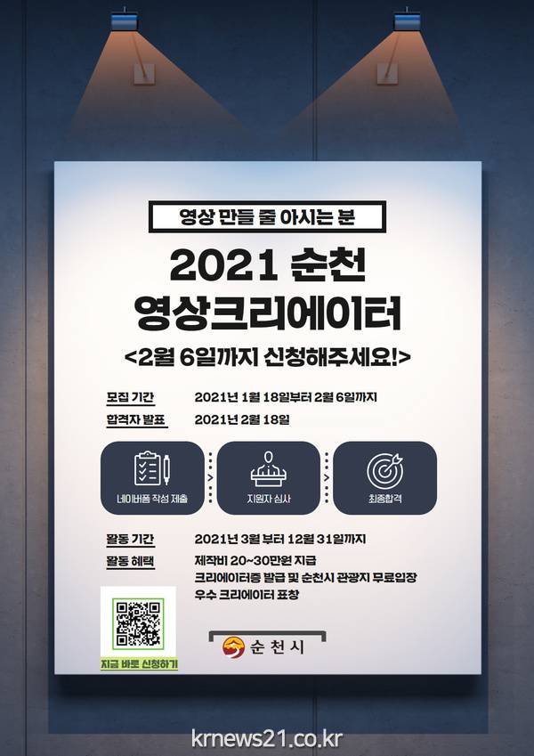 순천시(시장 허석)는 영상 창작을 통해 순천의 다양하고 생생한 소식을 전할 ‘2021 순천 영상크리에이터’를 오는 2월 6일까지 모집한다.