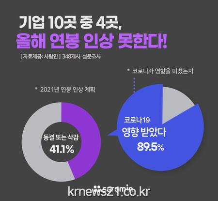 구인구직 매칭플랫폼 사람인(대표 김용환)이 기업 348개사를 대상으로 ‘2021년 연봉 인상 계획’에 대해 조사한 결과, 41.1%가 ‘동결하거나 삭감할 것’이라고 답했다.