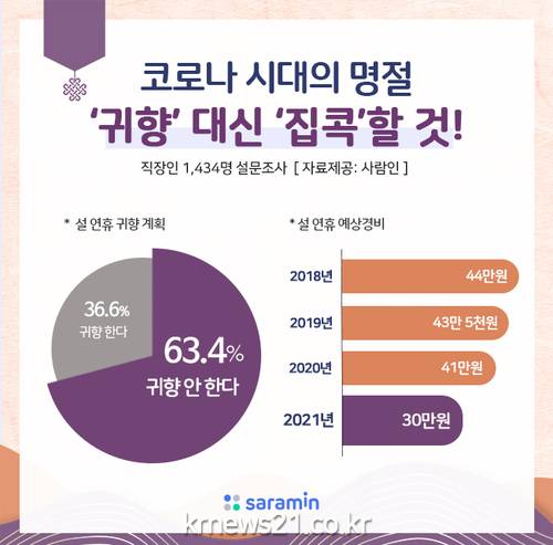 ▲ [자료제공 = 사람인]코로나19가 장기화되고 5인 이상 집합 금지 등 강화된 방역 대책이 계속되면서, 이주 앞으로 다가온 설 연휴에는 귀향객이 감소하는 등 달라진 명절 풍경이 예상된다.