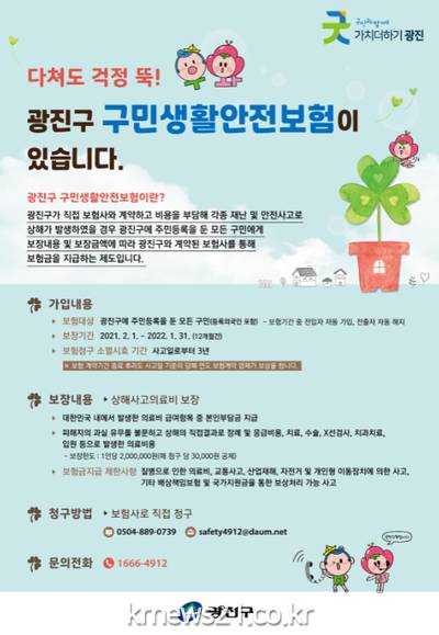 ▲ [사진=홍보포스터]광진구(구청장 김선갑)가 예기치 못한 각종 안전사고로부터 피해를 입은 구민에게 생활안정과 피해보상을 위한 제도적 장치를 마련하고자 구민생활안전보험에 가입했다.