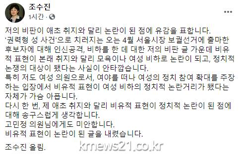 조 의원은 “‘권력형 성 사건’으로 치러지는 오는 4월 서울시장 보궐선거에 출마한 후보자에 대해 인신공격, 비하를 한 데 대한 저의 비판 글 가운데 비유적 표현이 본래 취지와 달리 모욕이나 여성 비하로 논란이 되고, 정치적 논쟁의 대상이 됐다는 사실이 안타깝다”고 했다. 여기서 4월 서울시장 보궐선거 출마 후보란 오세훈 전 서울시장을 가르킨다.