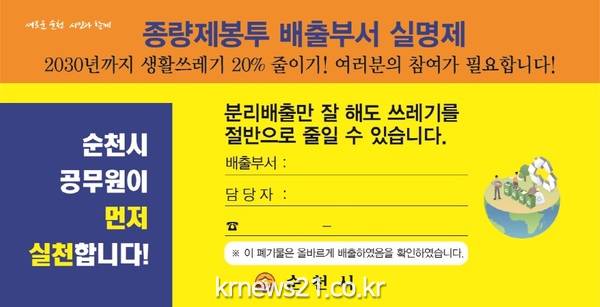 순천시의 산하 부서와 읍면동 행정복지센터에서는 사무실에서 발생하는 생활쓰레기 배출 시 종량제 봉투 앞면에 부서명을 기재한 스티커를 부착한 뒤 쓰레기를 내놓아야 한다.