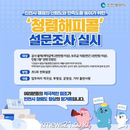 ▲ [사진=홍보포스터]인천광역시(시장 박남춘)는 민원인에게 직접 담당 공무원의 업무 관련 청렴도를 묻고 건의사항을 수렴하는 ‘청렴 해피콜’을 연중 실시한다고 밝혔다.