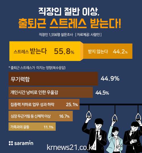 구인구직 매칭 플랫폼 사람인(대표 김용환)이 직장인 1,556명 대상으로 ‘출퇴근거리 스트레스와 업무 영향’에 대해 조사 한 결과 55.8%가 ‘평소 출퇴근시간에 스트레스를 느낀다’고 답했다. 이 중 절반은 ‘매일 출근할 때마다 느낀다’(50%)고 답했다. 이른바 ‘출퇴근 지옥’에 시달리고 있는 것이다.