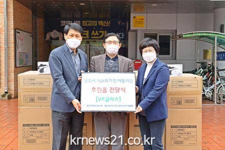 전달식에는 (사)한국지역복지봉사회 조승철 이사장과 광주시 건강가정‧다문화가족지원센터 오영희 센터장, 광주시 지역아동센터연합회 김길수 회장이 참석했다. VR글라스는 스마트기기에 연결해 VR체험 및 3D영상과 게임까지 즐길 수 있는 제품으로 디지털정보 격차를 줄이기 위해 광주시 관내 지역아동센터와 7R청소년 공감센터 등을 이용하는 아동과 청소년에게 전달될 예정이다.