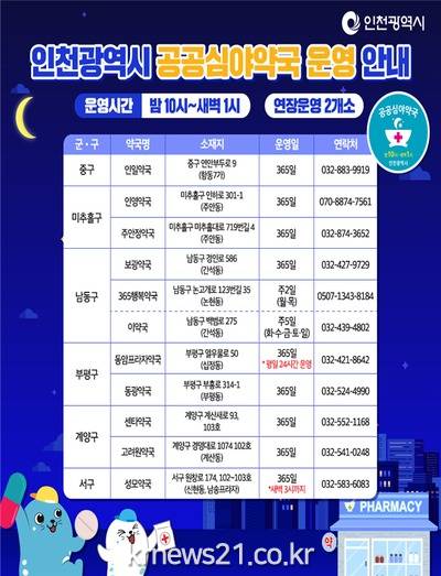 현재는 6개구에 11개소를 운영하고 있으나, 상대적으로 공공심야약국이 없는 지역인 동구, 연수구, 강화군, 옹진군은 해당 군‧구와 인천약사회 등 지속적인 협의를 통해 확대할 예정이다.