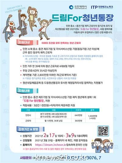 ▲ [사진=홍보포스터]인천광역시(시장 박남춘)는 인천시 중소・중견기업 청년재직자를 위한‘드림 포(For) 청년통장 사업’ 참여자를 2월 17일부터 3월 9일까지 모집한다고 밝혔다.