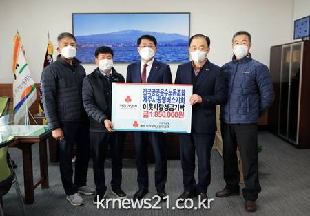 제주시공영버스지회 정형수 지회장은 “코로나19로 모두가 지치고 힘든 시기에 설을 앞두고 어려운 이웃들에게 조금이나마 도움을 드릴 수 있는 뜻깊은 일이 생겨 기쁘다”며 “앞으로도 지역사회에서 나눔활동을 꾸준히 실천할 수 있도록 노력하겠다”고 말했다.