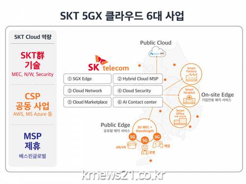 SKT 클라우드 6대 사업이란 △에지 클라우드(Edge Cloud) △하이브리드 클라우드 MSP(Hybrid Cloud MSP) △클라우드 보안(Cloud Security) △클라우드 네트워크(Cloud Network) △클라우드 마켓플레이스(Cloud Marketplace) △AICC(AI Contact Center)을 뜻한다.