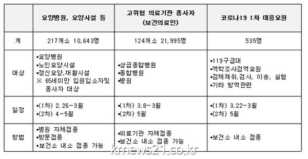 아스트라제네카는 백신은 2월 26일부터 3월 10일까지 1회 접종을 하고, 2회 접종은 1회 접종자의 접종 시기에 맞춰 4월에 접종한다.